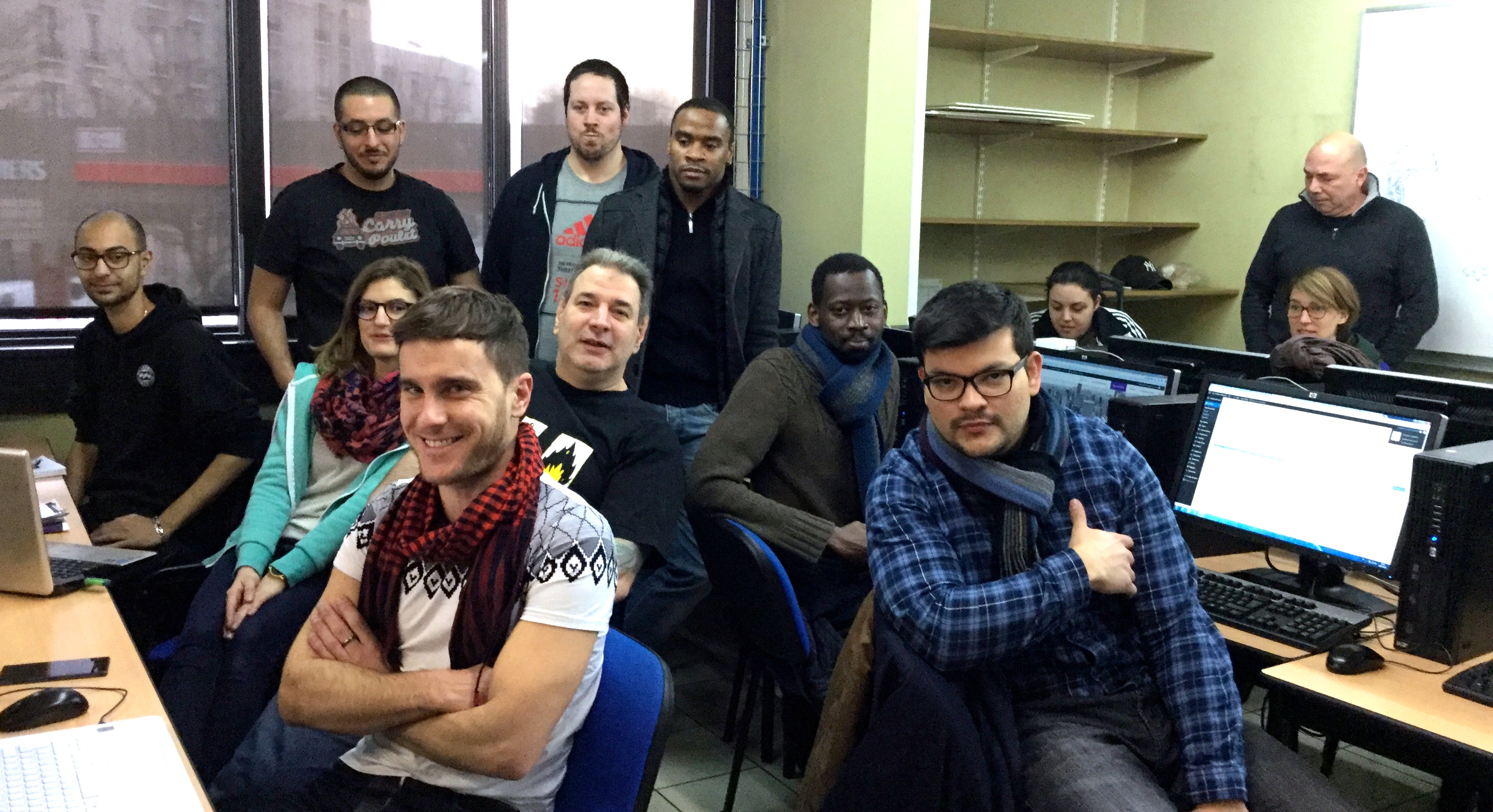 [De g. à d.] : Maxime, Julien, Perrine, Matthieu, Yoann, Carlos, Xavier, Aladi, Alfredo, Paméla, Mario, Livane